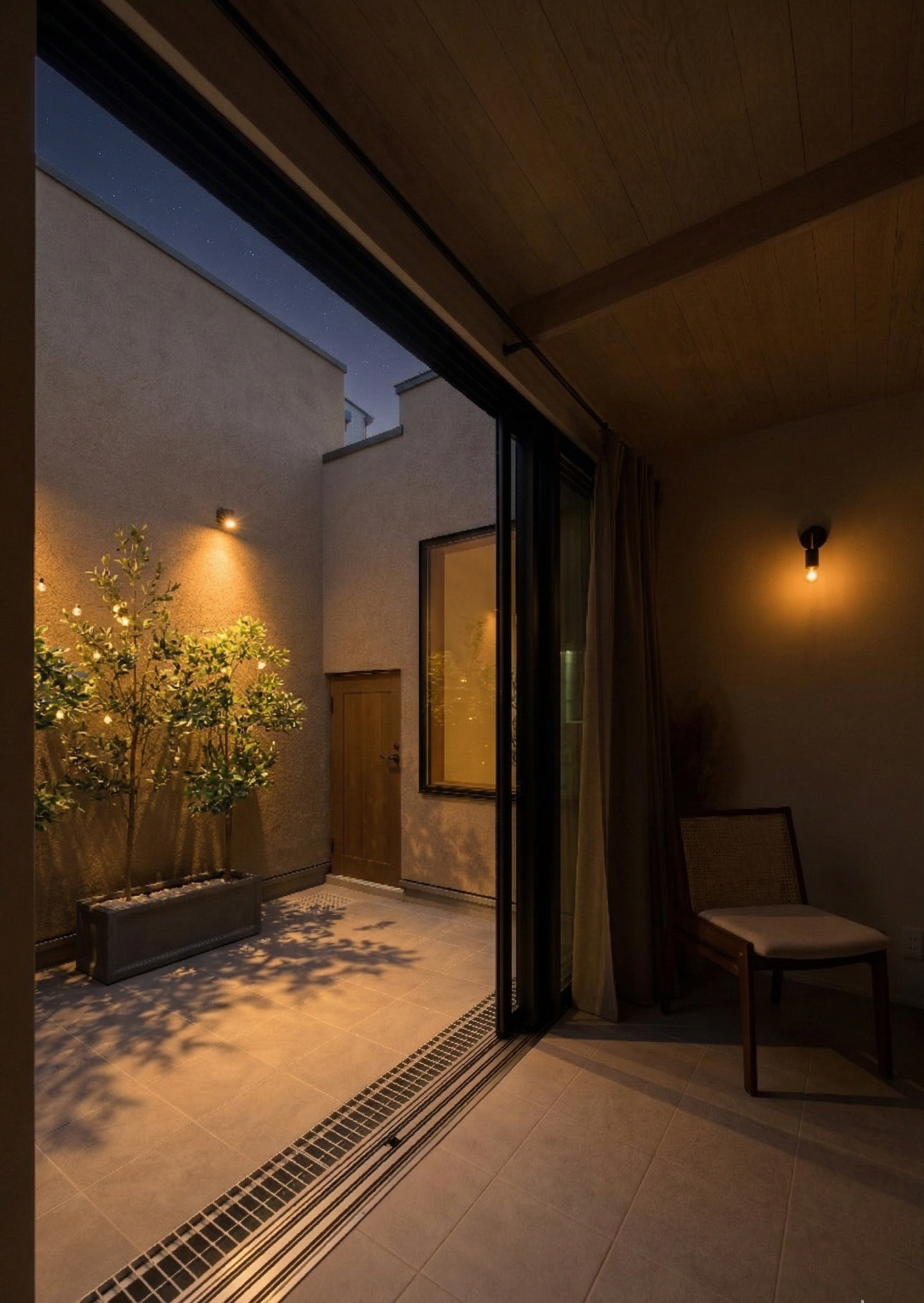 夜はテラスの灯りで、