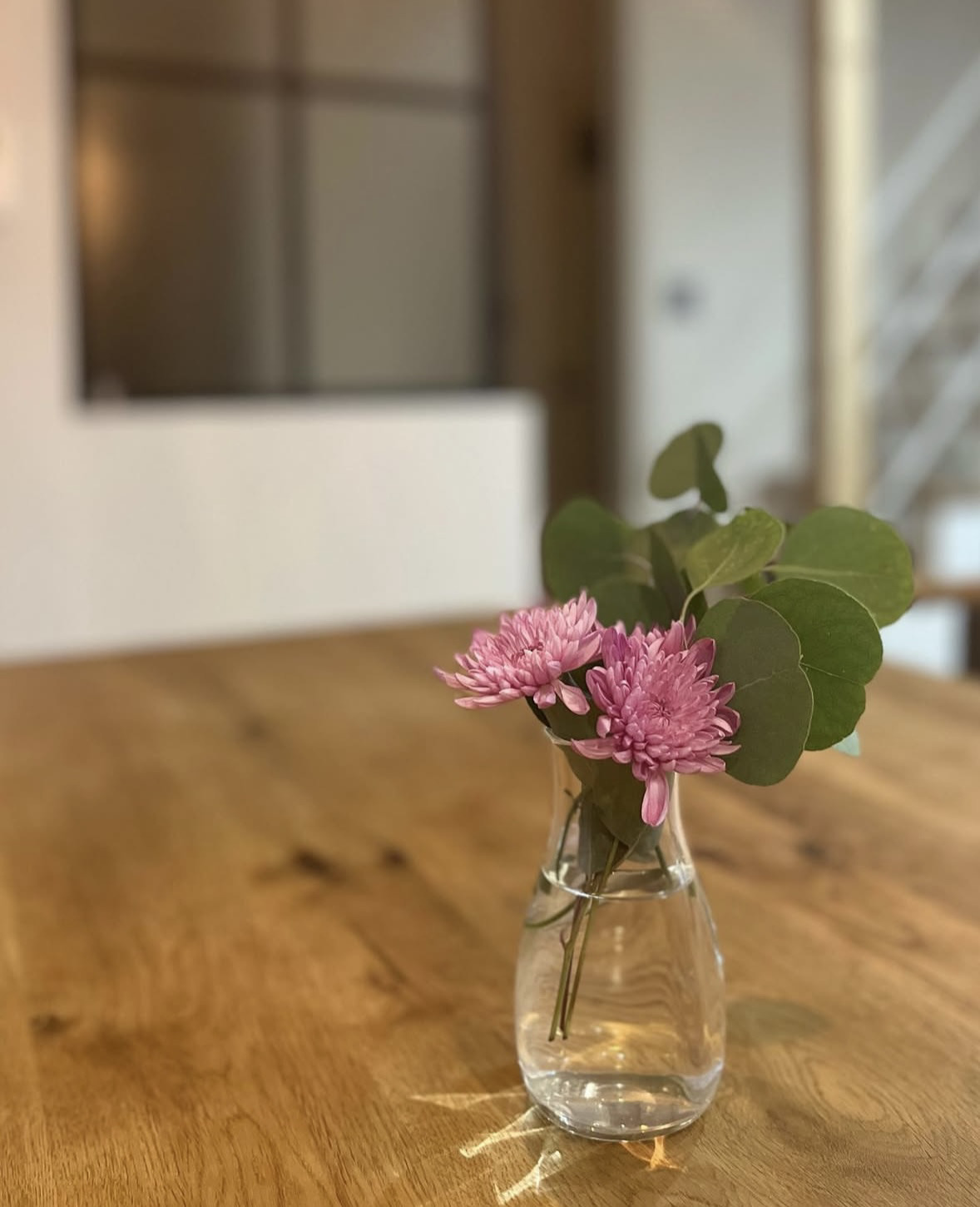友だちが持ってきてくれたユーカリにマムを添えて𖤣𖥧𖥣𖡡𖥧𖤣 お花があるだけで気持ちがやわらかくなる♬