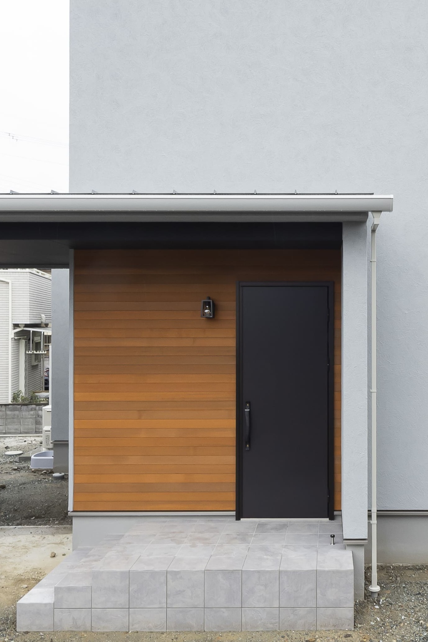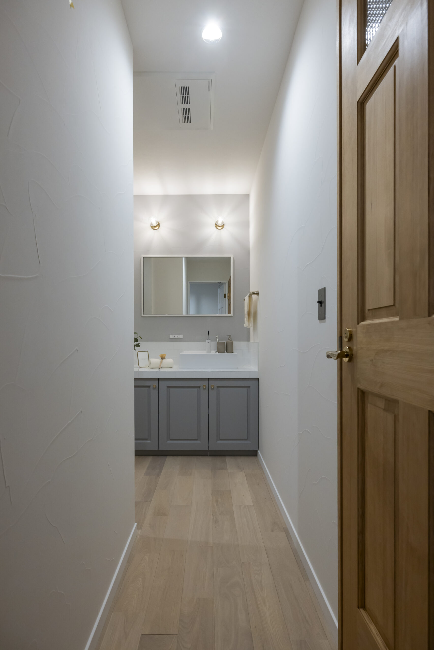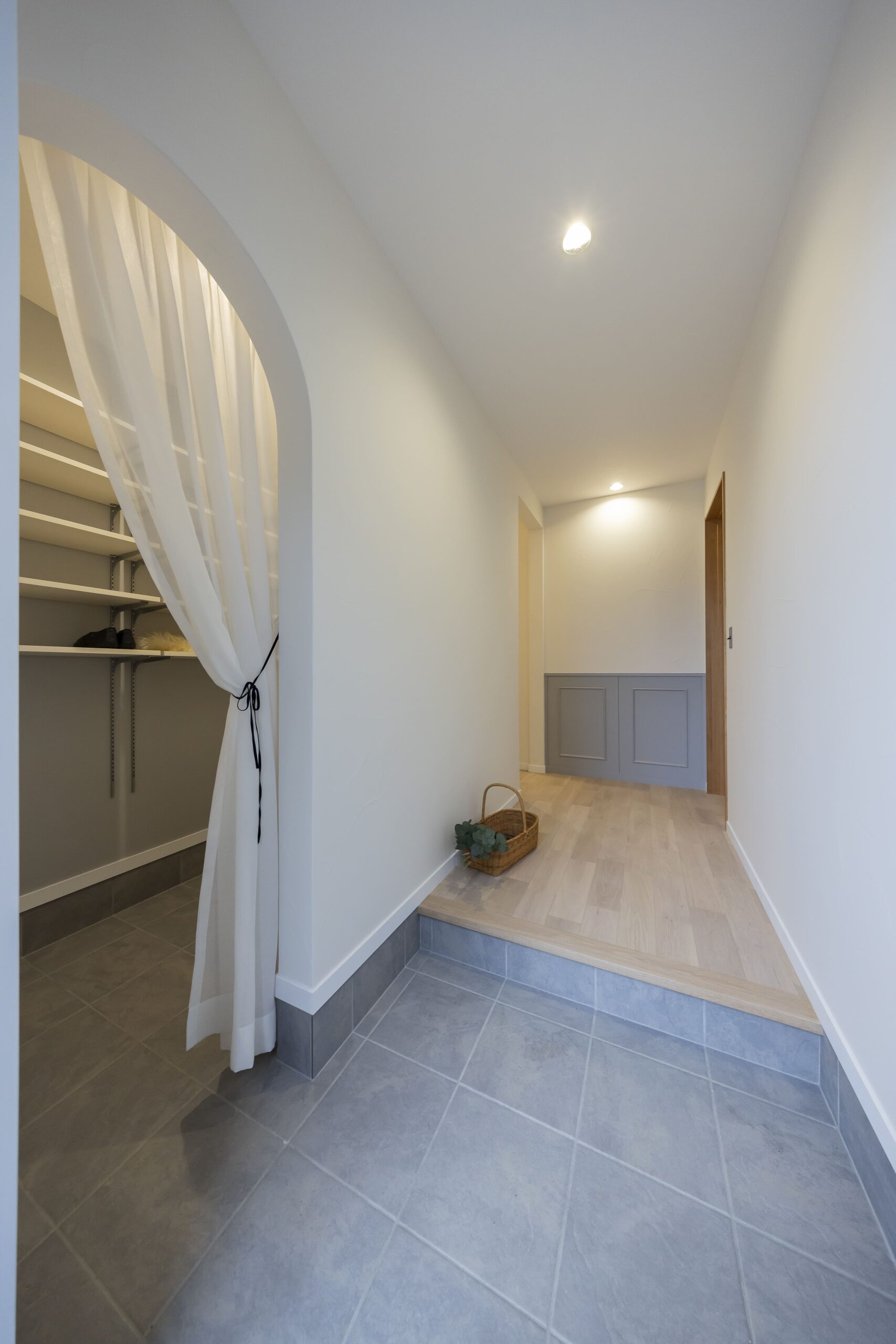 奥様お気に入りのグレーのモールディングが迎えてくれます。
