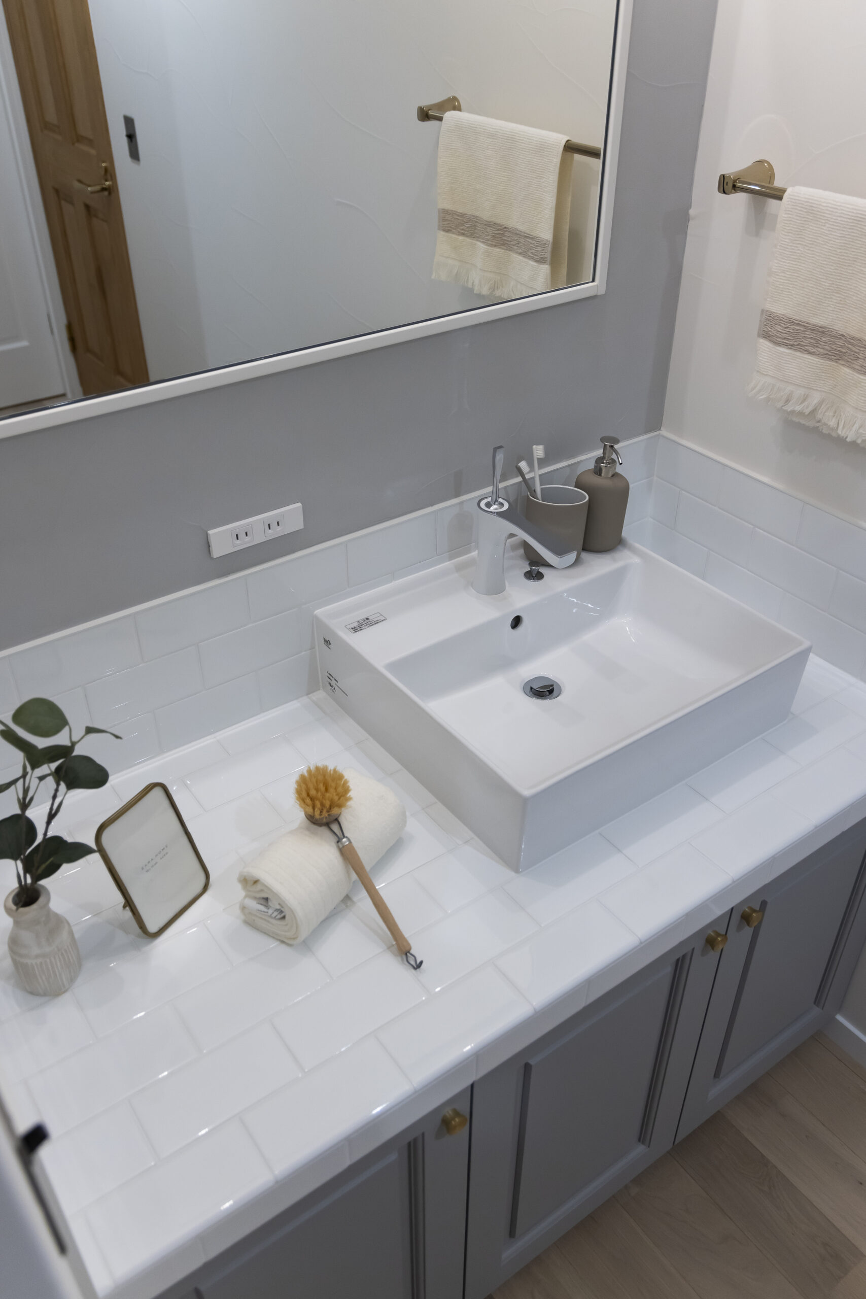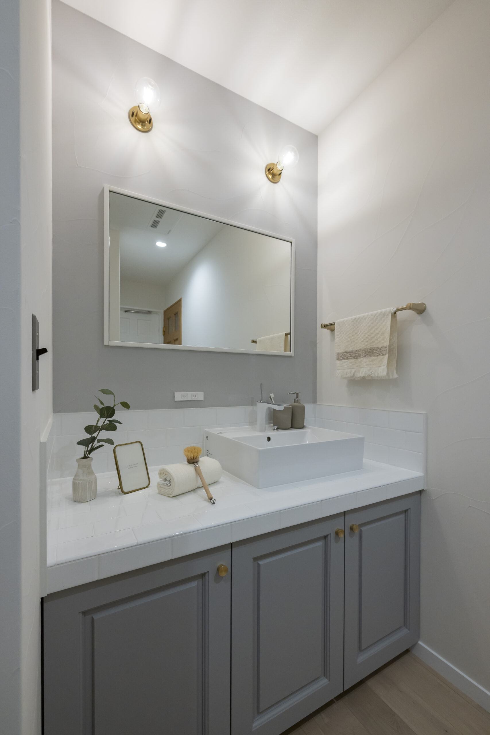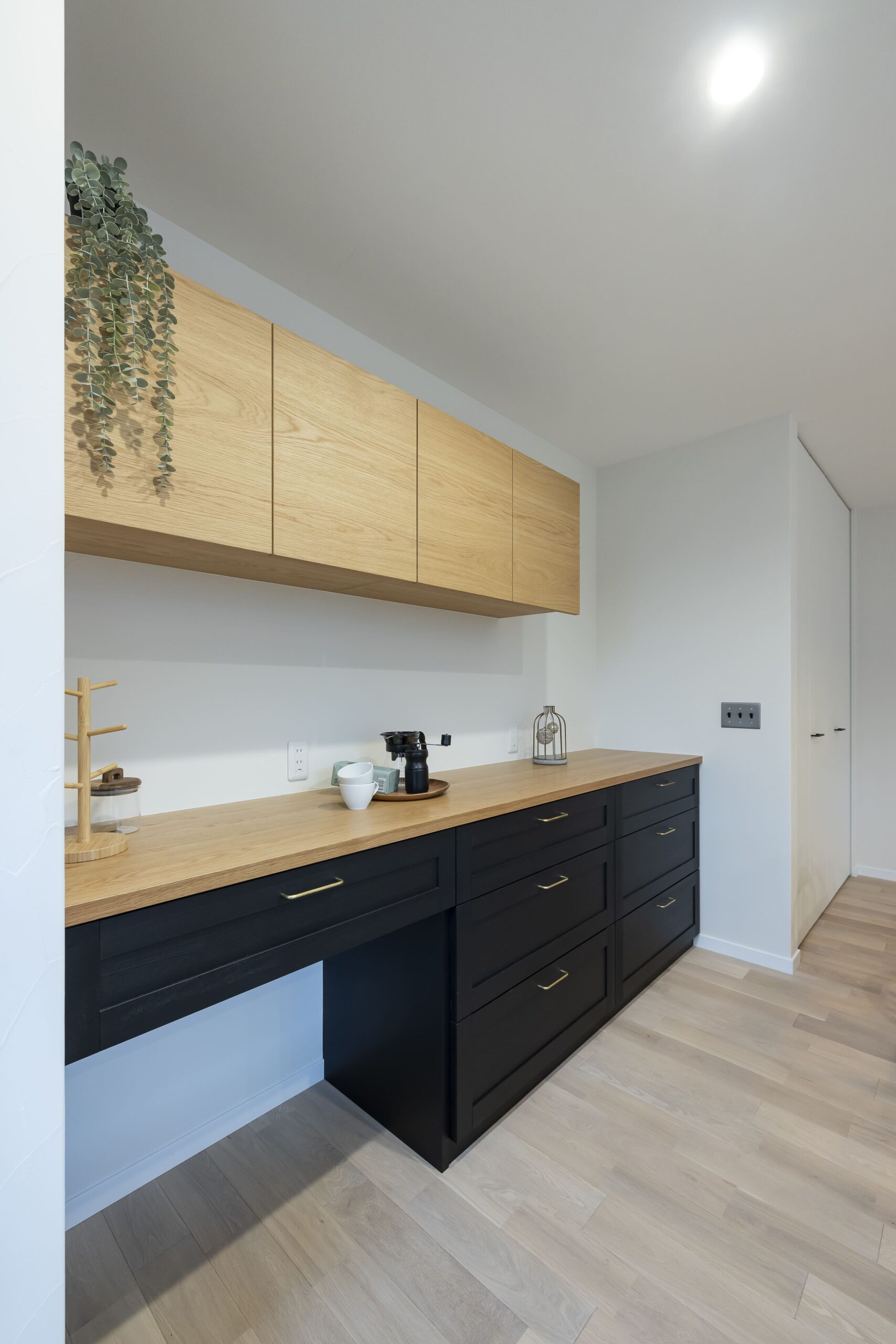 奥様お気に入りのグレーのモールディングが迎えてくれます。