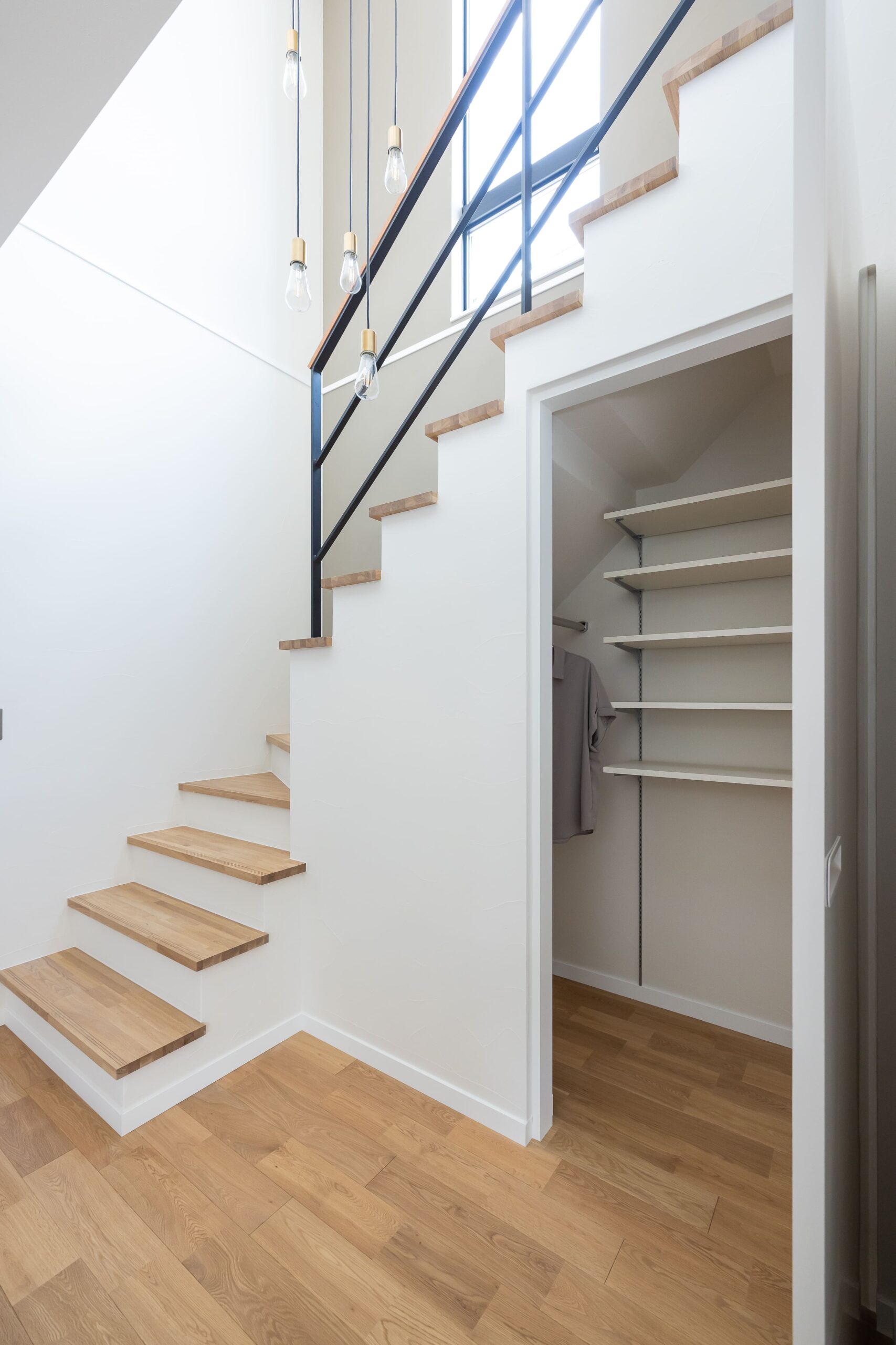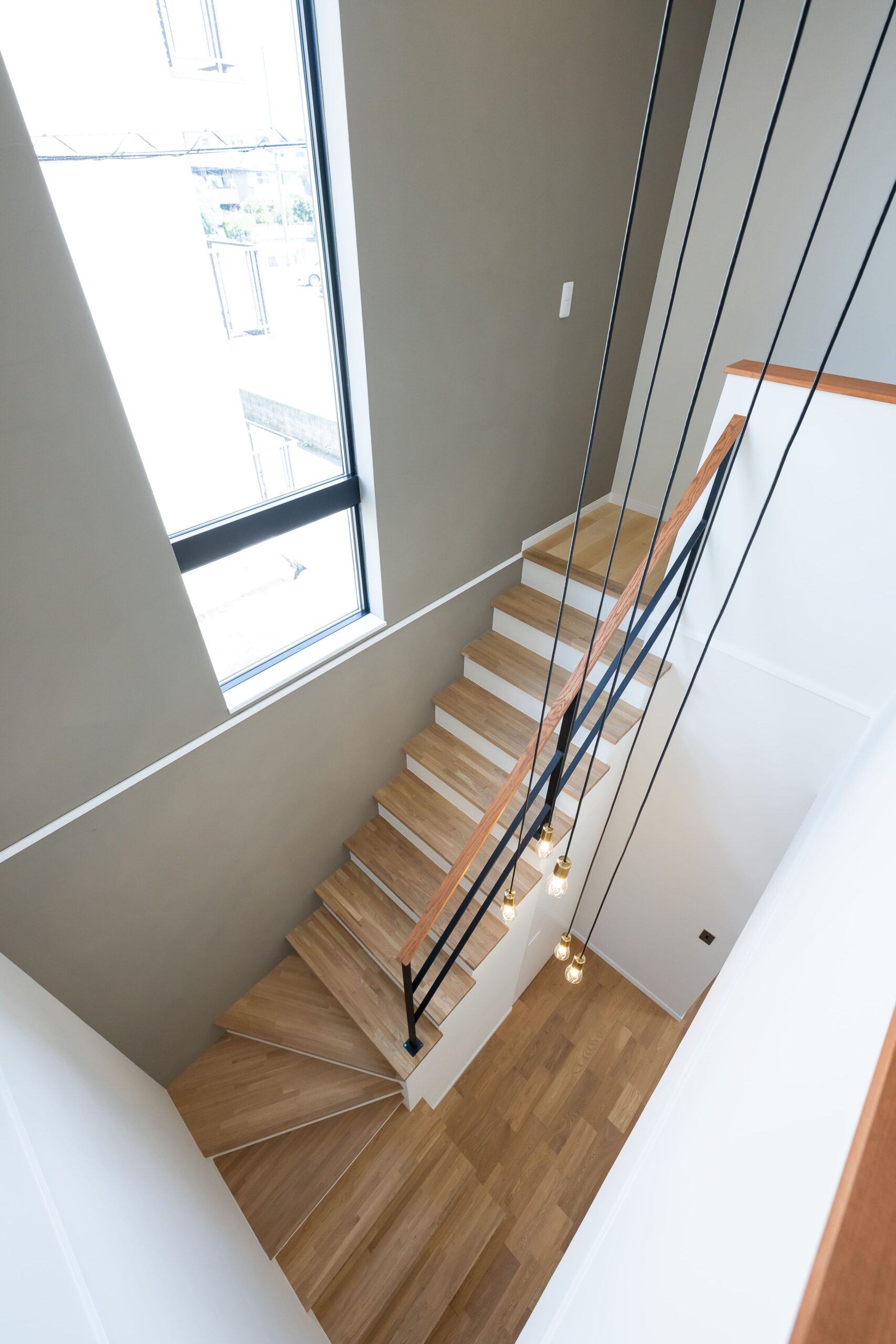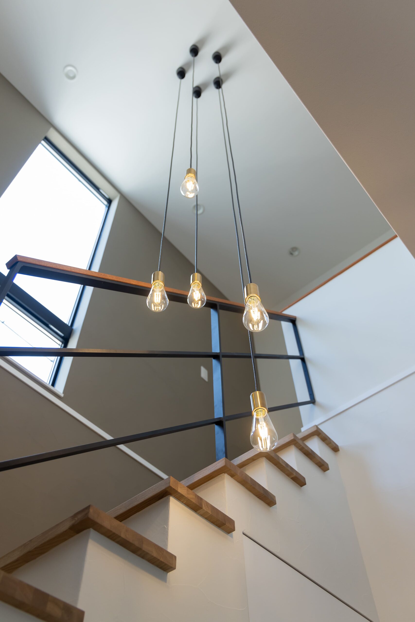吹き抜けにはペンダントライトを設置し、