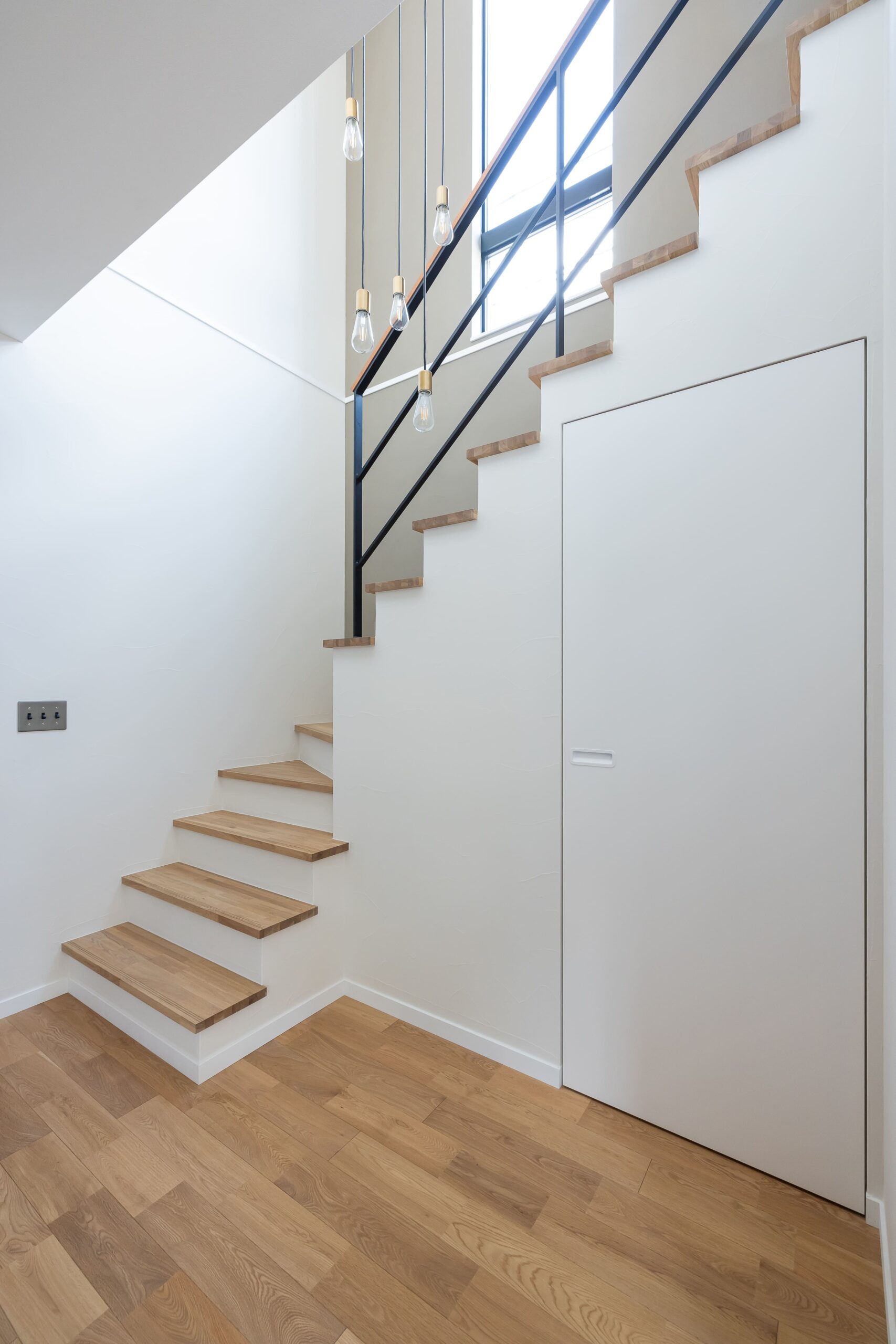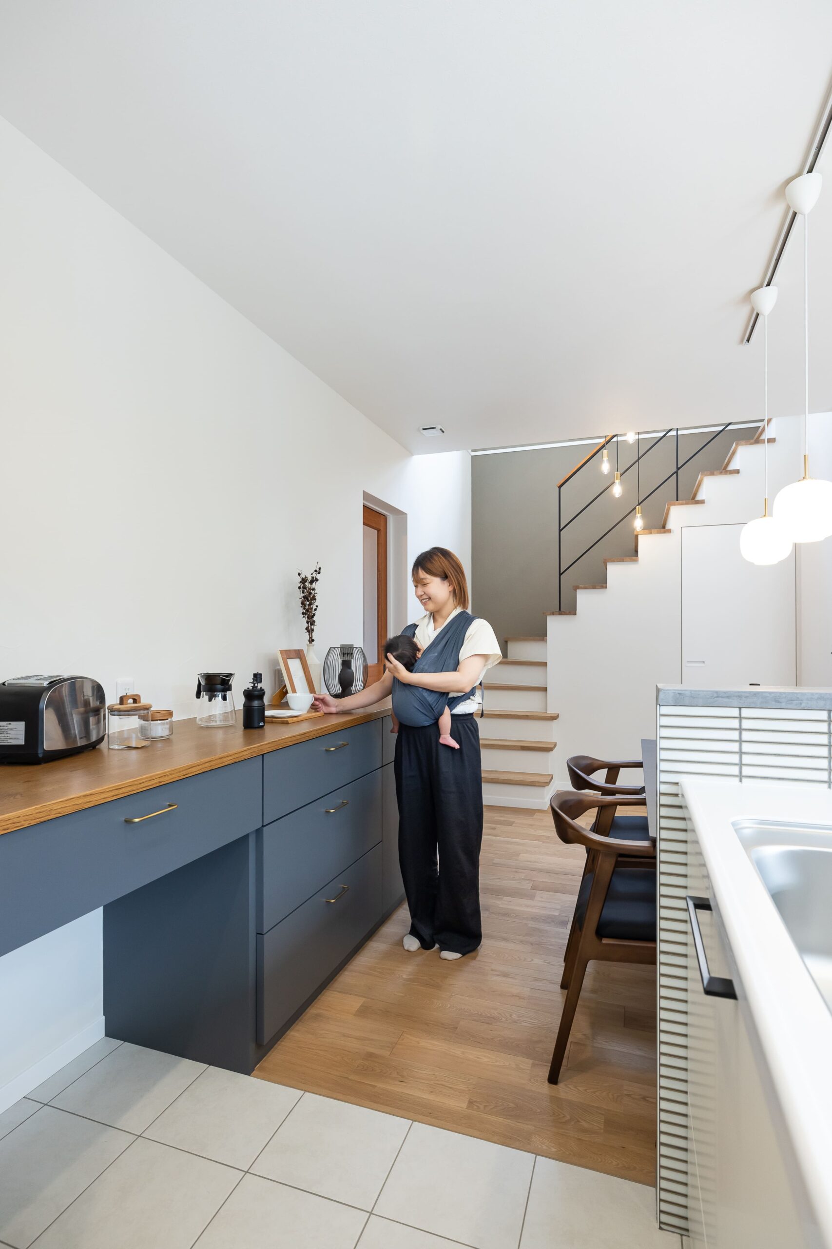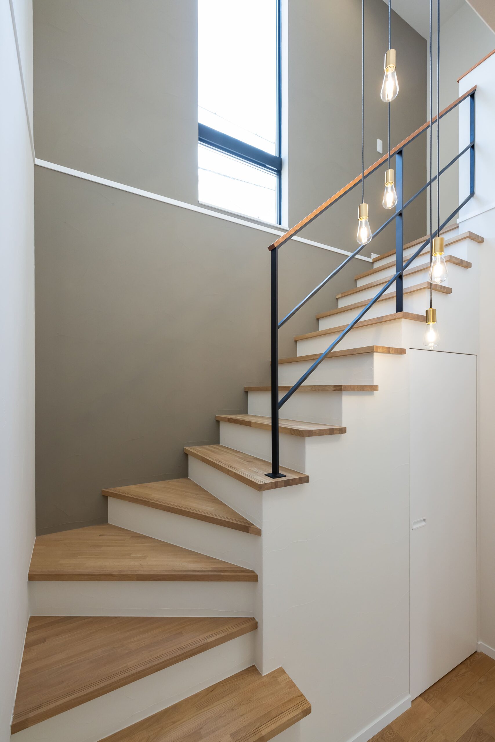 吹き抜けにはペンダントライトを設置し、