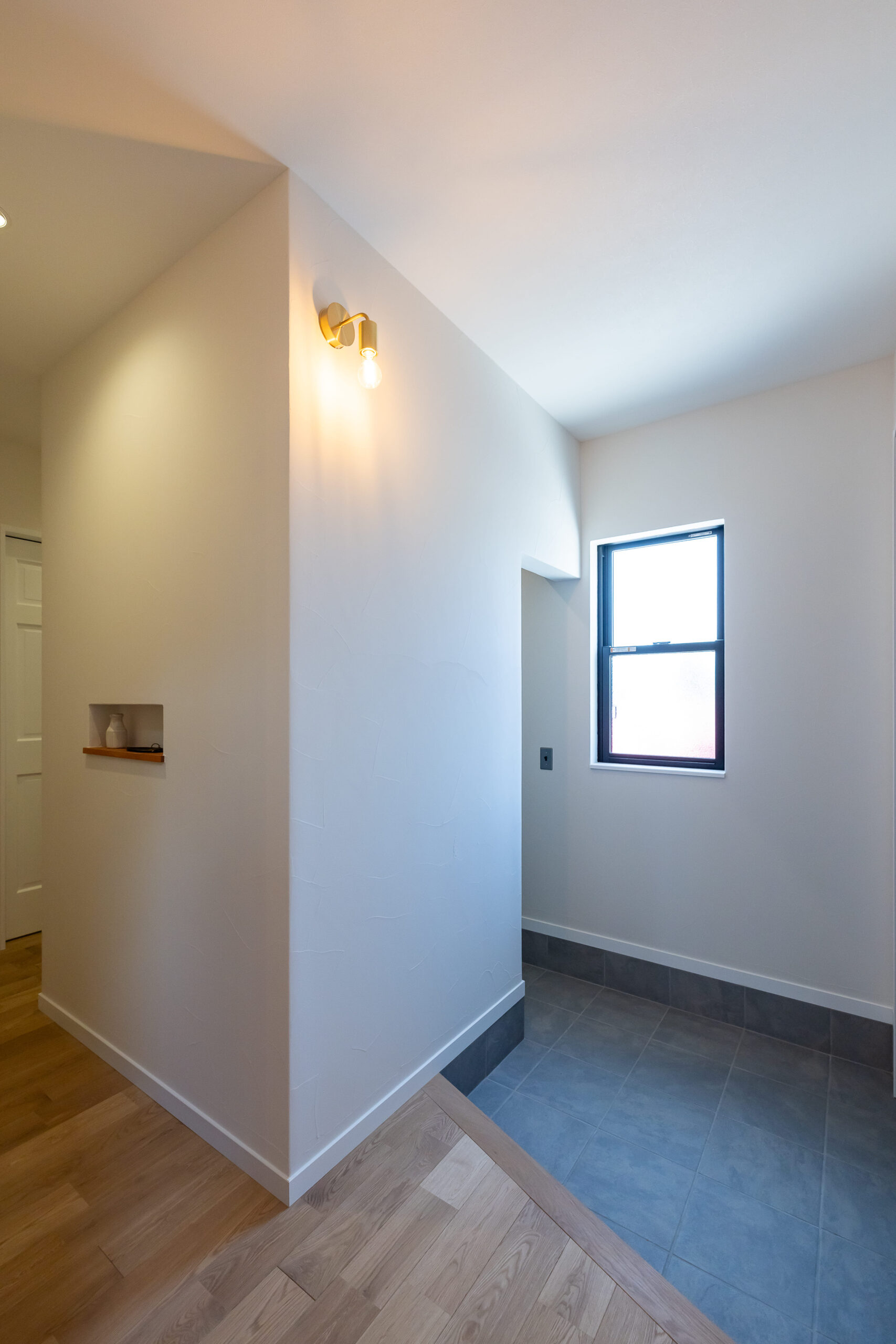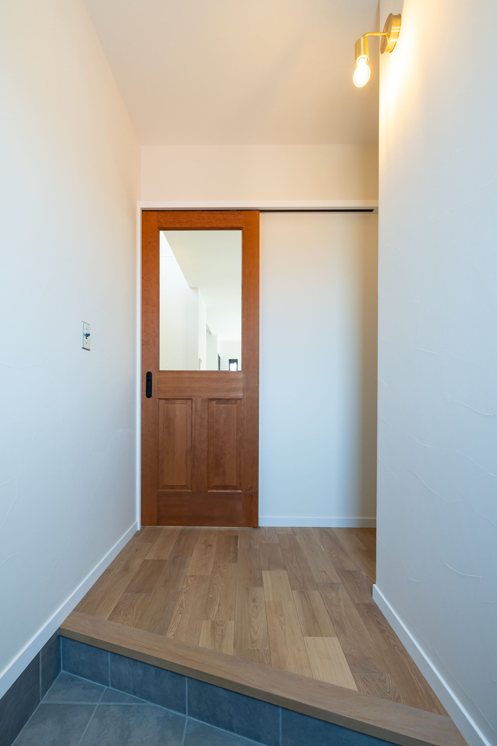 玄関では、真鍮のブラケットライトが